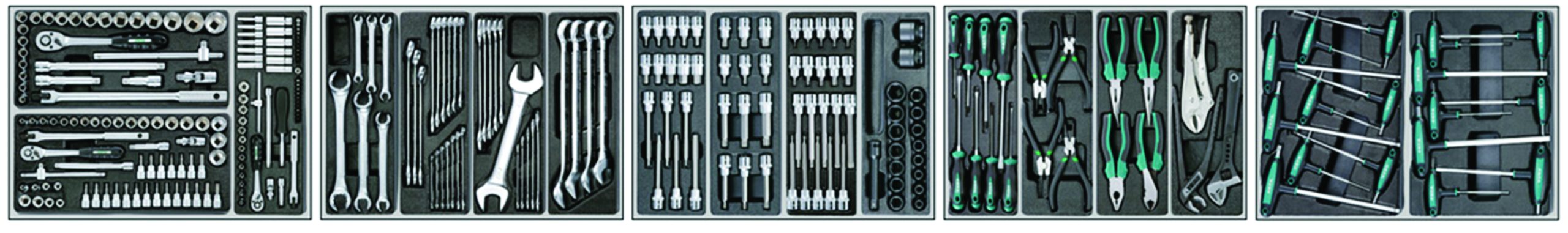- Rozbudowany zestaw kluczy płasko‑oczkowych, do przewodów hamulcowych, kluczy nastawnych, szczypiec Seegera, obcinaczek i kombinerki – to Warsztat w jednym wózku