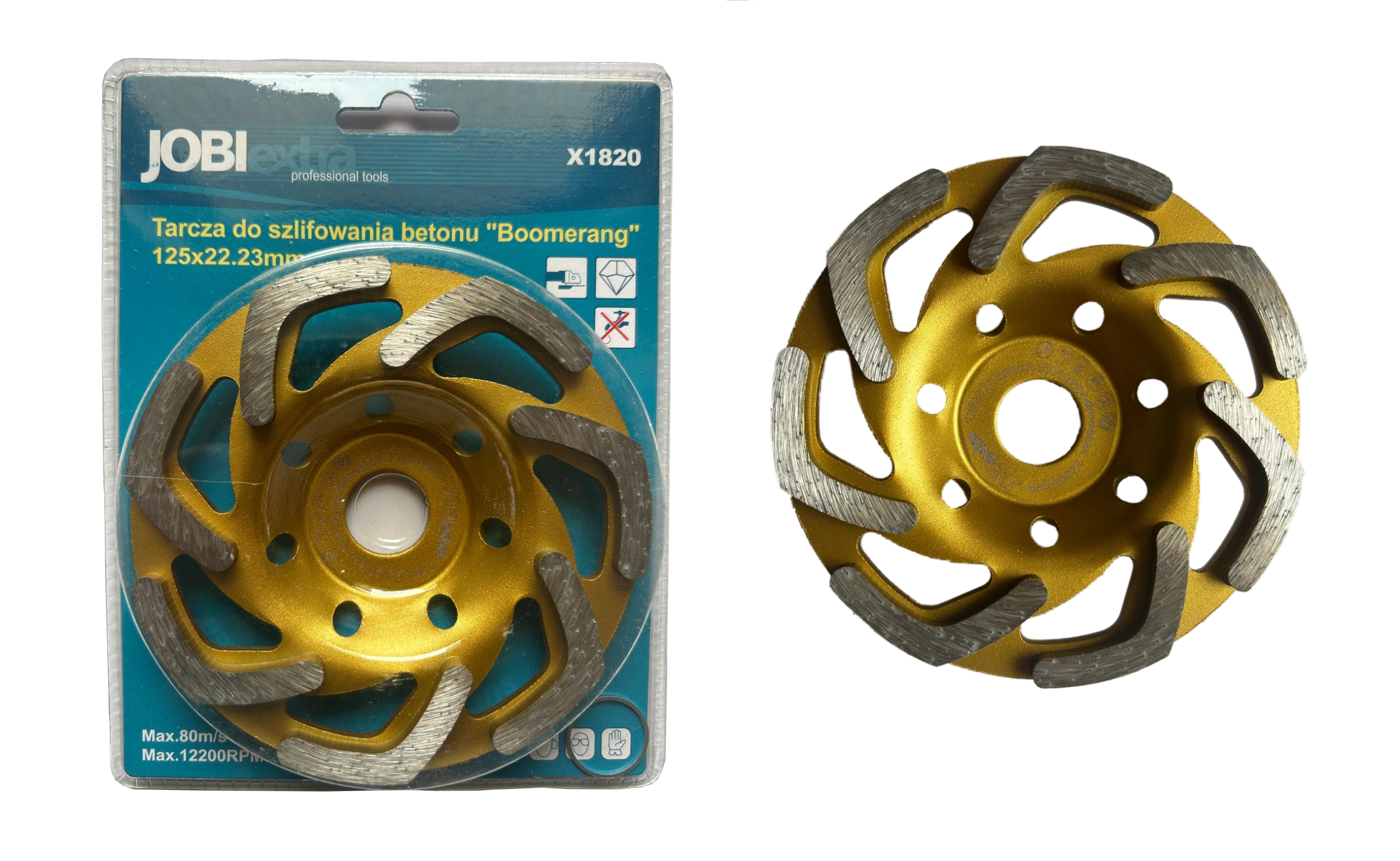 Tarcza diamentowa typu „bumerang” marki JobiExtra to profesjonalne narzędzie przeznaczone do szlifowania betonu, jastrychu, zapraw oraz innych twardych materiałów mineralnych. Charakterystyczny układ segmentów w formie łuków („bumerangów”) zapewnia szybsze zbieranie materiału i skuteczne odprowadzanie urobku, co przekłada się na większą wydajność i mniejsze obciążenie szlifierki.
